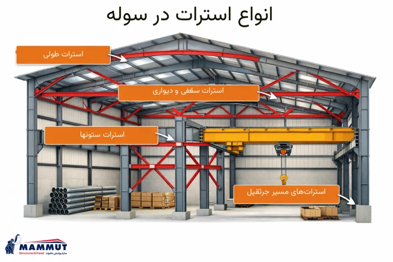 این استراتها مکمل سیستم مهاربندی هستند. در سقف، معمولاً در راس سوله (تاج) و یا در لبههای کناری (Eave Strut) اجرا میشوند و نقش حیاتی در تکمیل عملکرد بادبندهای افقی (Horizontal Bracing) و انتقال بار باد به فونداسیون دارند.